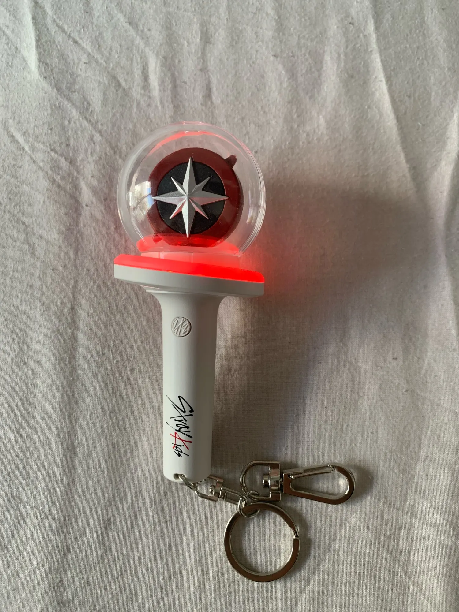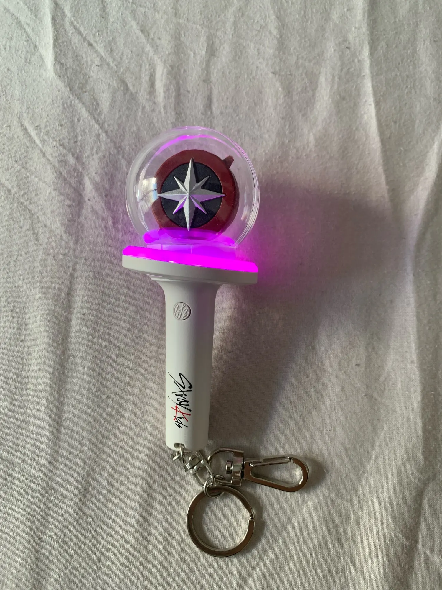 The Stray Kids Mini Lightstick Keychain is a compact, light-up accessory in 4 modes, perfect for fans. It's adjustable in color and speed, and includes a built-in battery.